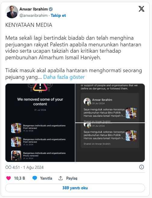 Malezya Başbakanı İbrahim, geçen hafta Haniye'nin vefatı sonrası bir Hamas yetkilisine taziyelerini ilettiği telefon konuşmasının görüntülerinin yer aldığı videoyu ve Haniye ile kucaklaşırken çekilmiş bir fotoğrafı Facebook ve Instagram'a yüklemiş ancak bu paylaşımlar Meta şirketi tarafından kaldırılmıştı.
